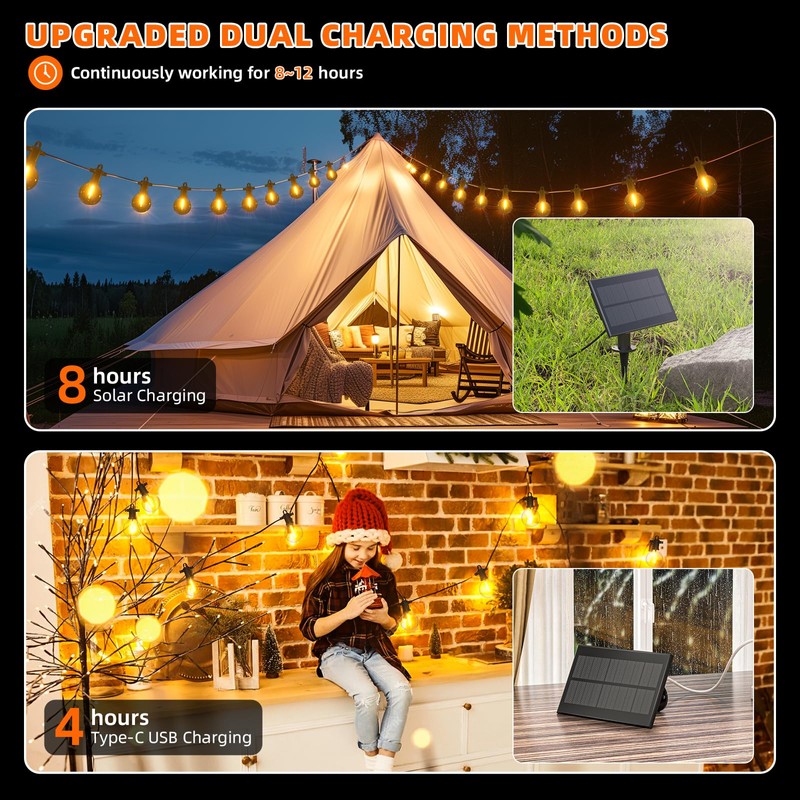 - UPGRADED USB CHARGING: This solar panel is equipped with a convenient Type-C charging port, providing a reliable solution for cloudy or rainy days when sunlight is scarce. Once fully charged, the solar panel provides up to 12 hours of illumination.