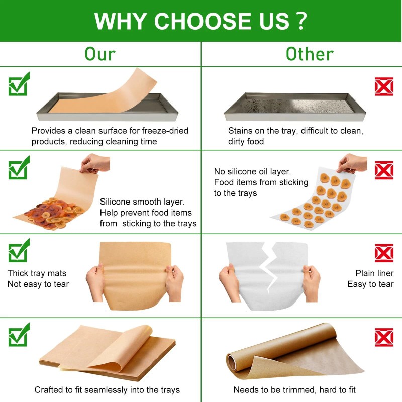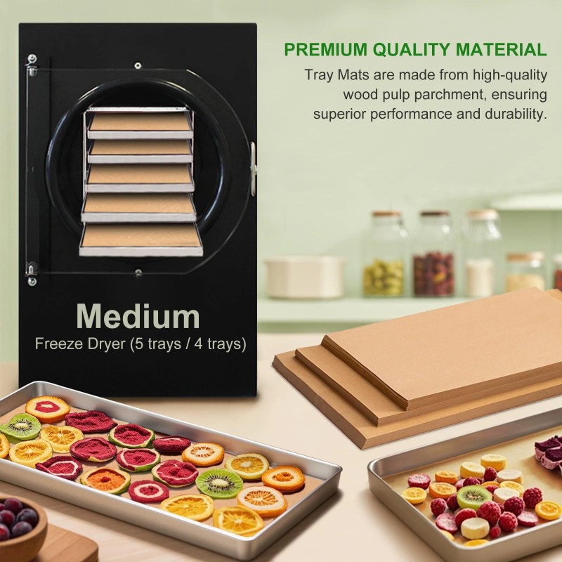 - 【Premium Quality Material】Our tray mats are made from high-quality wood pulp parchment, ensuring superior performance and durability. The wood pulp material is green, providing a clean environment for your freeze-dried foods. Each mat is designed to withstand the freeze drying process without compromising its integrity.