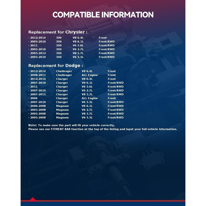 • 【Vehicle Compatible】:513224 Wheel Bearing and Hub Assembly fits for 2005-2014 300, 2006-2014 Charger, 2008-2014 Challenger, 2005-2008 Magnum
