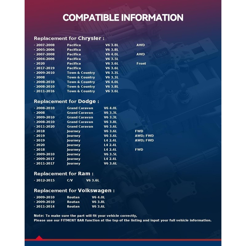 • ➤Compatibility : 5x5 to 5x4.75 Wheel adapters 1.25 inch are compatible with ALL For:; 2011-2020 Grand Caravan 3.6L FLEX/GAS V6; 2011-2016 Town & Country 3.6L FLEX/GAS V6; Journey 3.6L FWD GAS V6; 2009-2020 Journey 2.4L FWD GAS L4; 2017-2019 Pacifica 3.6L FWD FLEX/GAS/PLUG-IN HYBRID EV-GAS (PHEV) V6; 2008-2010 Town & Country 3.3/3.8/4.0L FLEX/GAS V6; Grand Caravan 3.3/3.8/4.0L FLEX/GAS V6; 2011-2019 Journey 3.6L FWD FLEX V6; 2011-2017 Journey 3.6L AWD FLEX V6; 2009-2010 Journey 3.5L AWD/FWD G