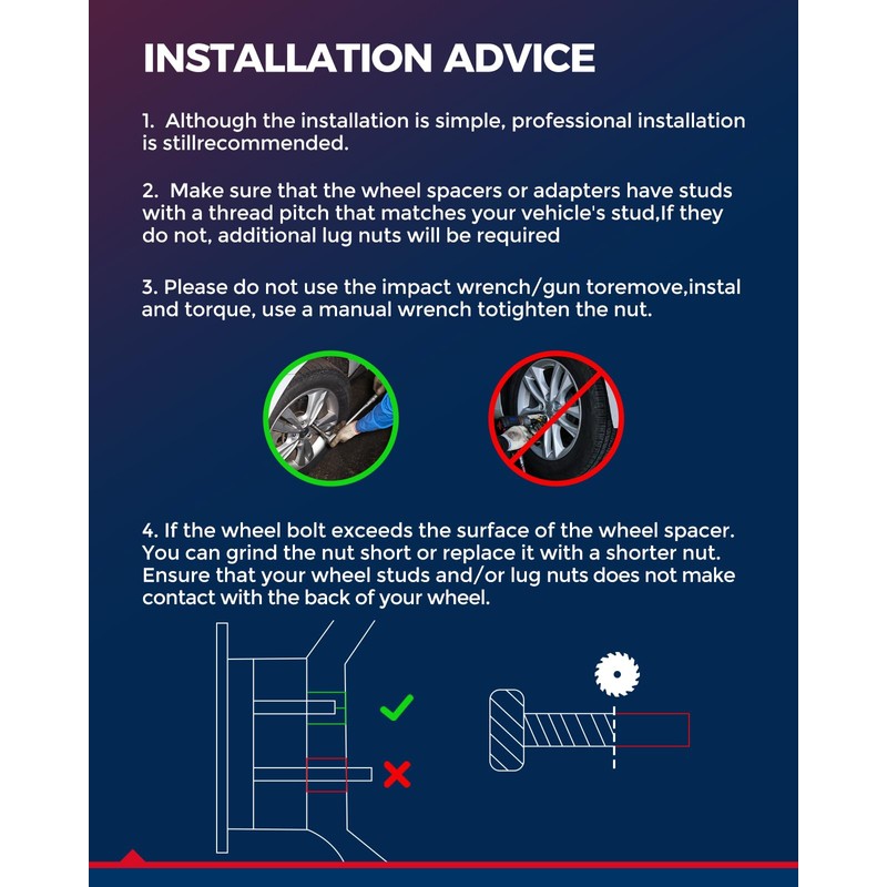 • ➤Warm Reminder : Even if a vehicle is listed as being compatible, buyers still need to check: 1) You have more than 2 inch of space between your fender and your wheel/tire; 2) Your factory wheel studs are shorter than 2 inch (NOTE: * When installing a bolt on wheel spacer or adapter, trimming the studs will be necessary when the spacer or adapter plate is thinner than your wheel studs are long.)