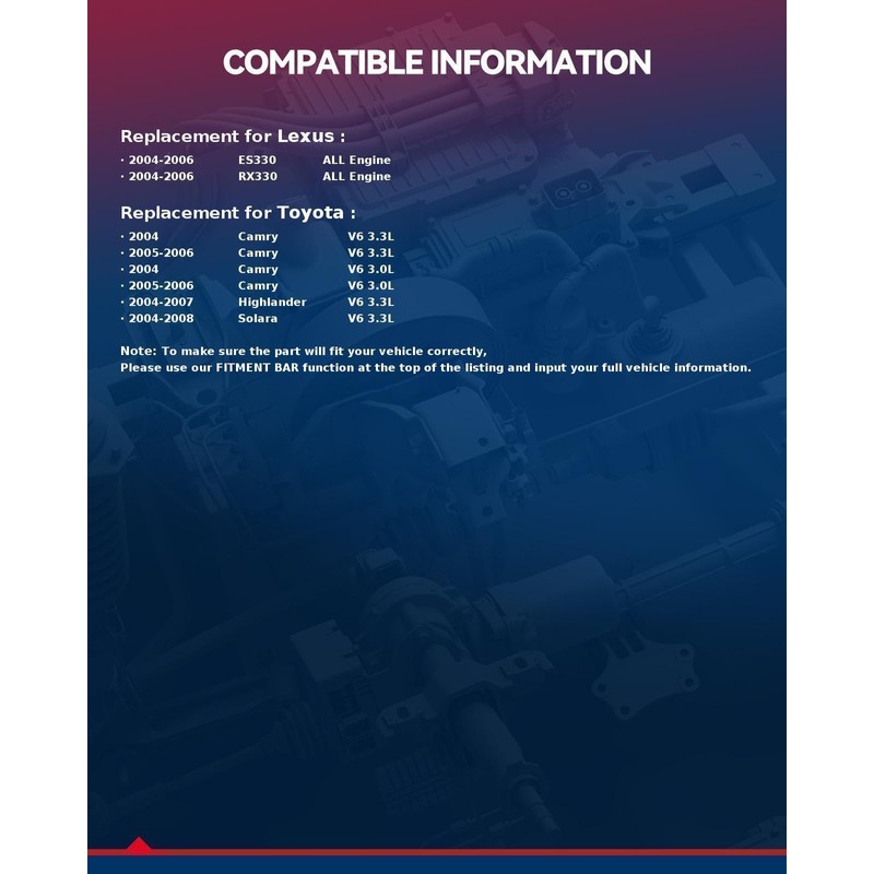 - Vehicle Fitment: 2004-2007 Highlander 3.3L, 2004-2006 RX330, 2004-2006 ES330, 2004-2008 Solara 3.3L, 2004-2006 Camry 3.0L, 2004-2006 Camry 3.3L
