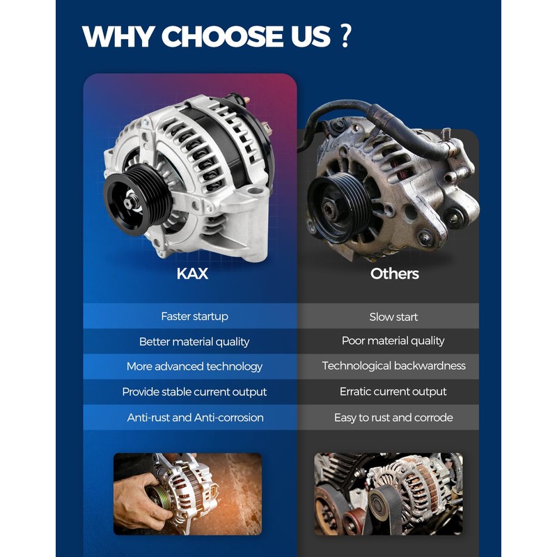 - Quality Construction:The KAX alternator offers high power density, efficiency, thermal stability, easy maintenance, a long lifespan, and versatile adaptability. It can withstand the harshest environments and provide electricity to the car as well as recharge the battery