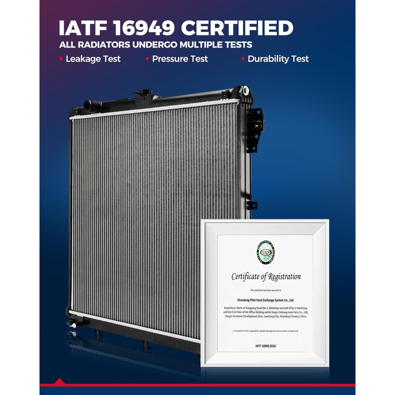- [High Efficiency and Durability] Our car radiators are constructed with high-density multi-louver fins, with a larger heat dissipation area for maximum cooling efficiency; they use high-grade plastic water tanks and aluminum cores to prevent corrosion and have excellent thermal conductivity. All radiators have been leak-proof tested, pressure tested, aging and durability tested, and comply with the IATF16949 quality management system, making them more stable, durable and reassuring