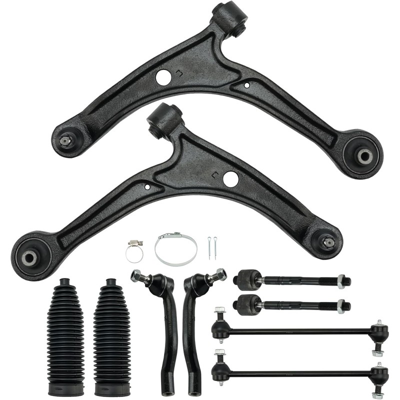 ✔Kit Includes:1x Front Lower Control Arm Assembly - Driver Side - K621349 + 1x Front Lower Control Arm Assembly - Passenger Side - K621350 + 2x Front Sway Bar End Link - K750124 + 1x Outer Tie Rod End - Driver Side - ES3717 + 1x Outer Tie Rod End - Passenger Side - ES3716 + 2x Inner Tie Rod Ends - EV471 + 2x Tie Rod Boots + Bellows w/locking C-Clamps