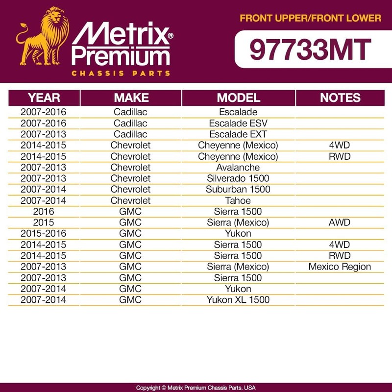 COMPATIBLE WITH: 2007-2016 Cadillac Escalade, 2007-2016 Escalade ESV, 2007-2013 Escalade EXT, 2014-2015 Chevrolet Cheyenne (Mexico) 4WD, 2014-2015 Cheyenne (Mexico) RWD, 2007-2013 Avalanche, 2007-2013 Silverado 1500, 2007-2014 Suburban 1500, 2007-2014 Tahoe, 2016 GMC Sierra 1500, 2015 Sierra (Mexico) AWD, 2015-2016 Yukon, 2014-2015 Sierra 1500 4WD, 2014-2015 GMC Sierra 1500 RWD, 2007-2013 GMC Sierra (Mexico) Mexico Region, 2007-2013 GMC Sierra 1500, 2007-2014 GMC Yukon, 2007-2014 Yukon XL 1500