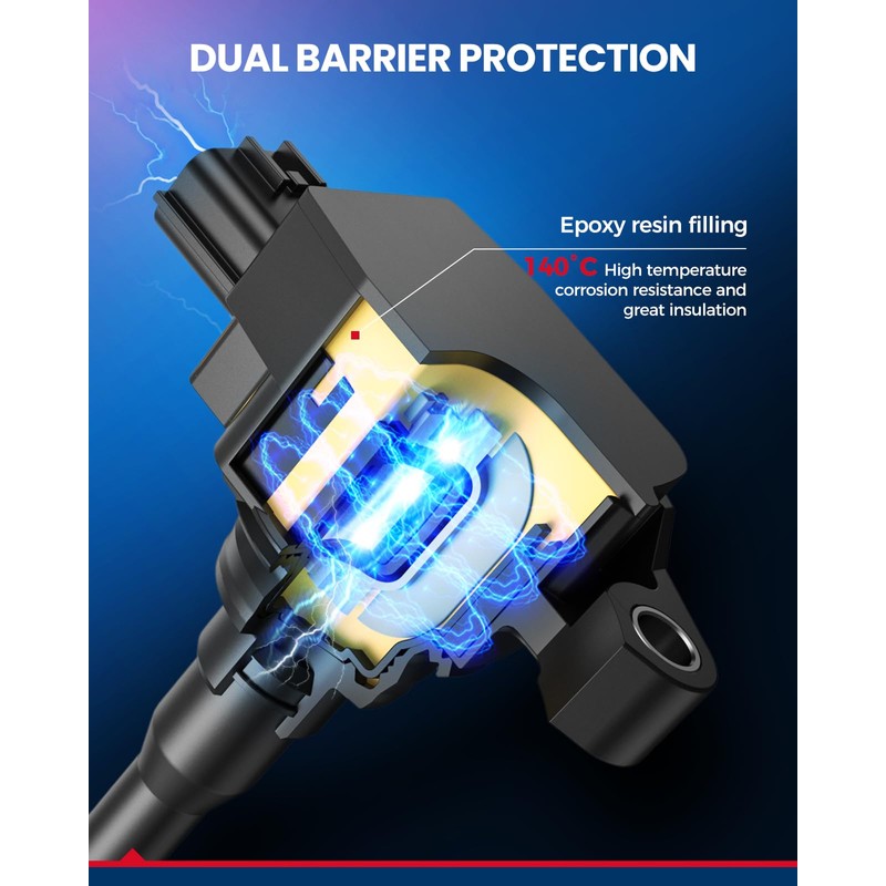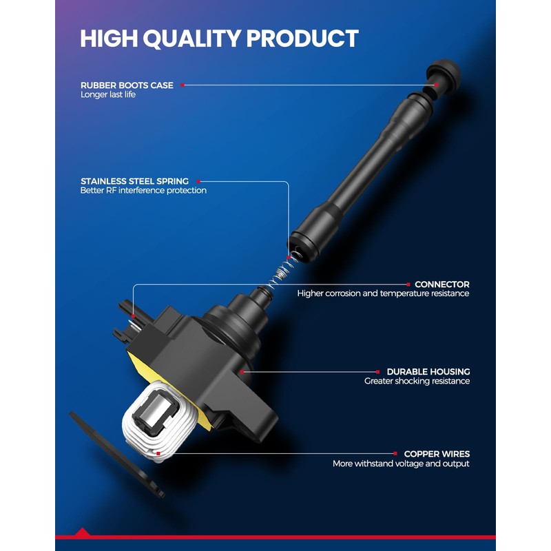 - Efficient work:Automotive replacement ignition coil | Fast ignition within 0.1-0.2 seconds | 140 ° C high temperature corrosion resistance | RF interference protection | 6500Mi longer lifespan | High voltage output | Smooth engine operation.