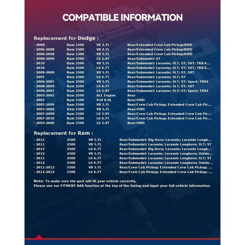 - Fitment - KAX Rear complete shock struts assembly fits 2003-2010 Ram 2500, 2003-2010 Ram 3500, 2011-2013 2500, 2011-2012 3500, 2006-2008 Ram 1500, Rear Left/Right Struts, 2Pcs.