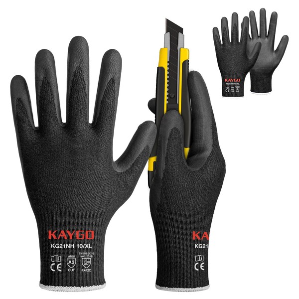 KAYGO Cut Resistant Gloves - Nitrile Micro-Foam Coated, Puncture Proof Safety Gloves for Work, Gardening, and Construction with Enhanced Grip | ANSI Cut Level A3 | KG21NB (Size XL, 2 Pairs, Black)