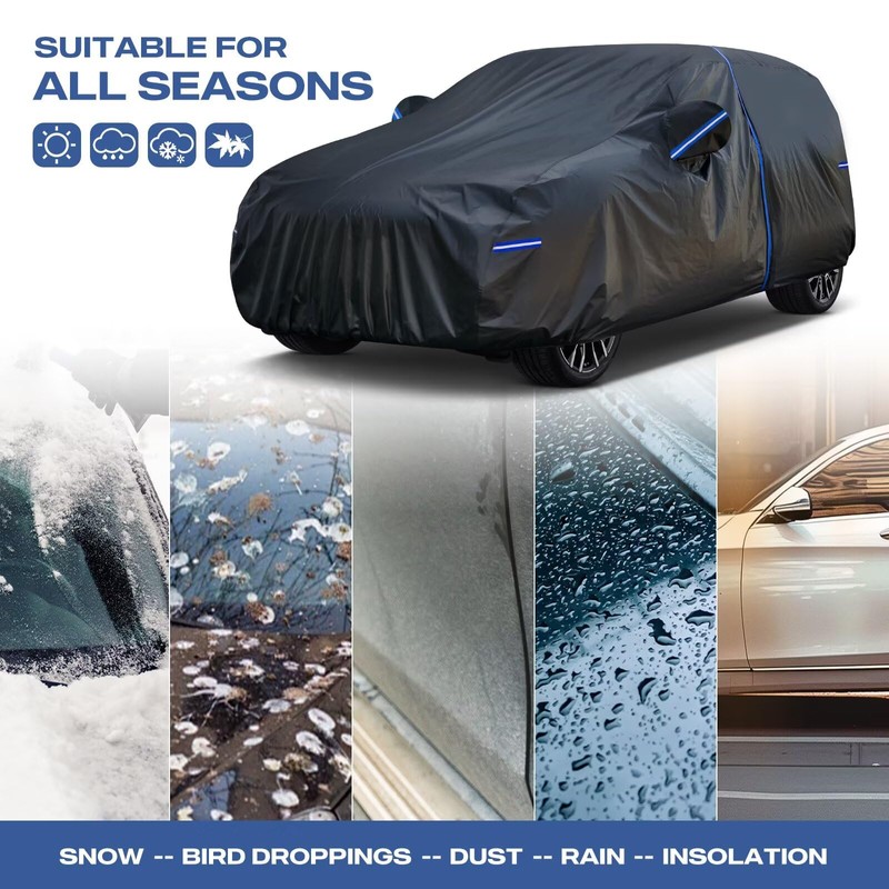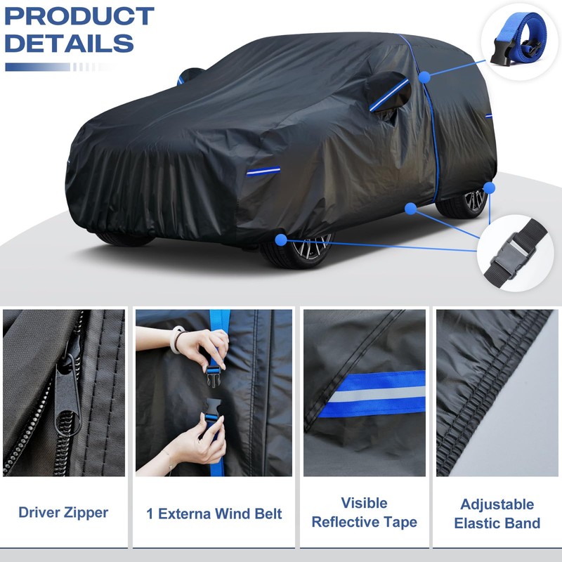 - 【Thoughtful Design: Practicality and Safety】①A zipper on the driver - side door enables fast in - car item access without removing the cover. ②Six reflective strips around the car create a visible warning at night, reducing the collision risks for parked cars. ③Three adjustable windproof straps keep the cover stable even in strong winds. ④The elastic band at the bottom provides a tight fit to block dust and prevent displacement.