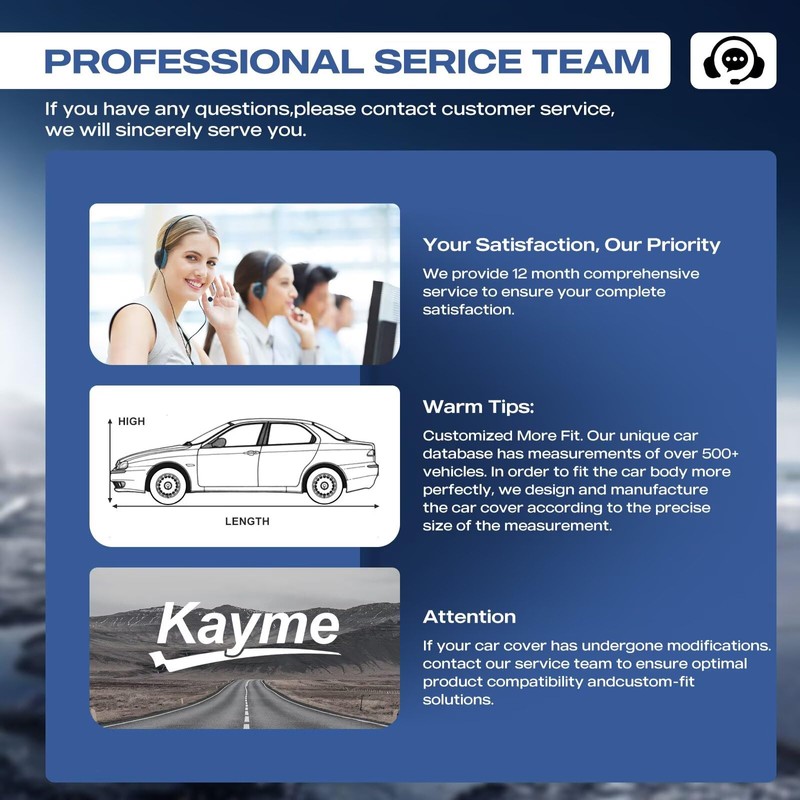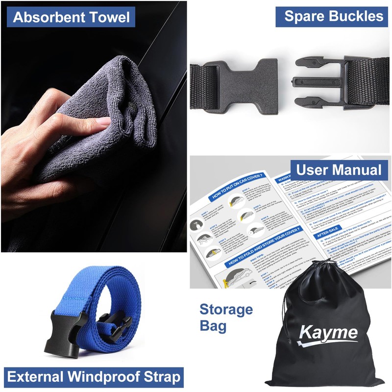 - 【Upgraded Accessories: A Better User Experience】Kayme waterproof car covers have key accessories for a better experience.①External blue windproof strap: Guards car in rough weather, keeps cover from flying away.②Towel: Cleans car and cover, stops sand/gravel from scratching paint.③Spare buckle: Replaces lost/damaged original during shipping.④Storage bag: For easy storage and carrying of cover.⑤Instruction manual: Clearly shows quick, correct installation & use.