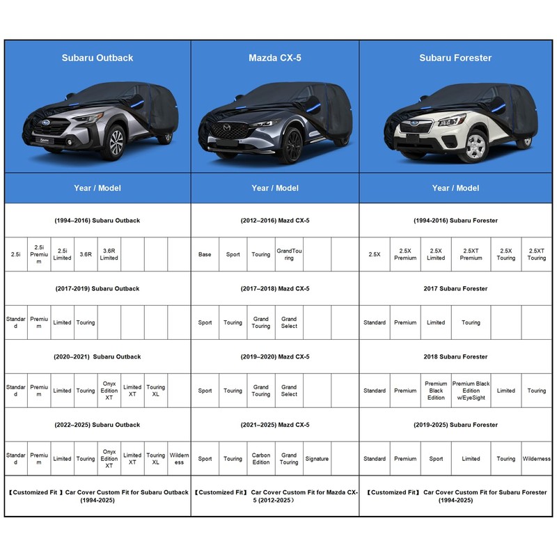 - 【Custom Fit: Superior Protection】This full car cover is meticulously crafted for Subaru Outback (1994-2025), Mazda CX-5 CX 5 CX5, CX-50 CX 50 CX50 (2012-2025), Subaru Forester (1994-2025). The precisely - matched dimensions ensure a perfect fit for your vehicle. This not only extends the lifespan of the car cover by reducing wear and tear but also provides more durable and comprehensive protection for your beloved car.