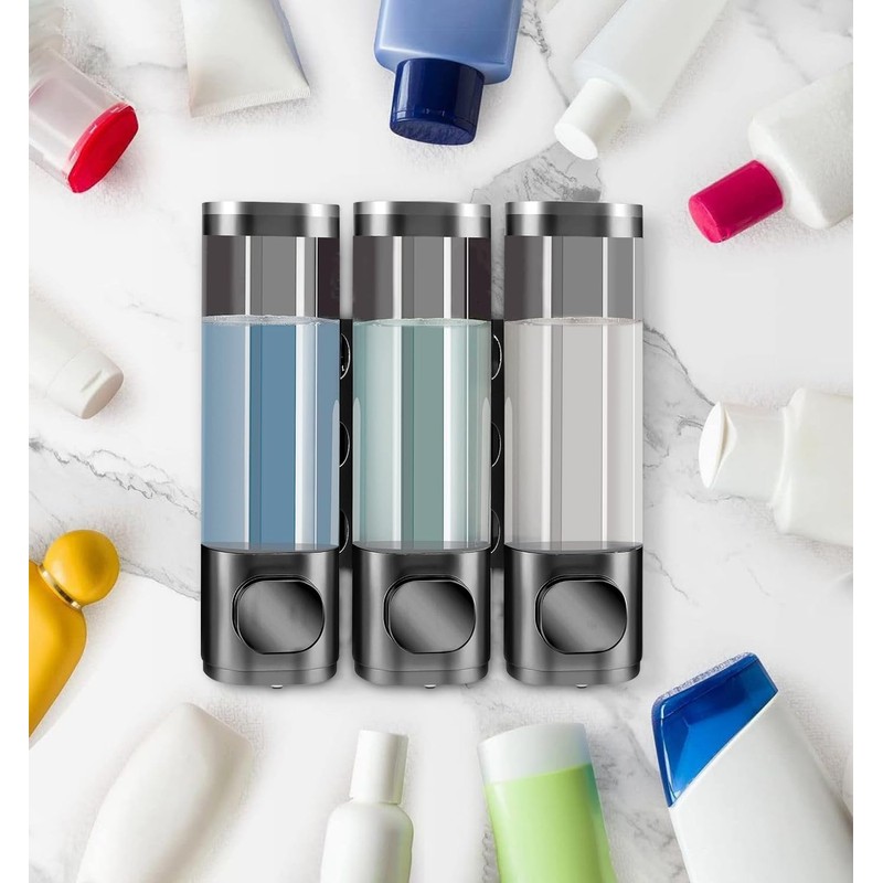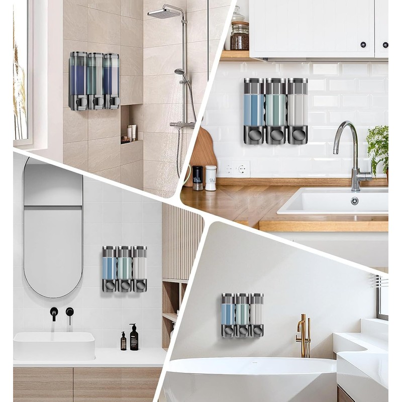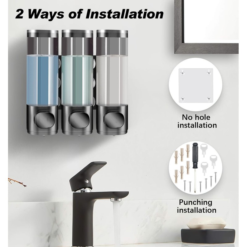 - Large Capacity for Convenience: Equipped with 3* 300ml chambers, this shower dispenser 3-chamber no-drill simplifies your routine and keeps your shower organized! The transparent body allows you to easily monitor liquid levels, ensuring you never run out of your shampoo or body wash