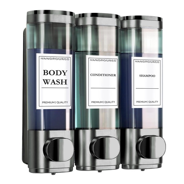 Kazaigou Shampoo and Conditioner Dispenser, 3 IN 1 Wall Mounted Shower Soap Dispenser, No Drill Shampoo Pump Dispenser for Shower Bathroom Hotel, 3 * 300ml with Labels