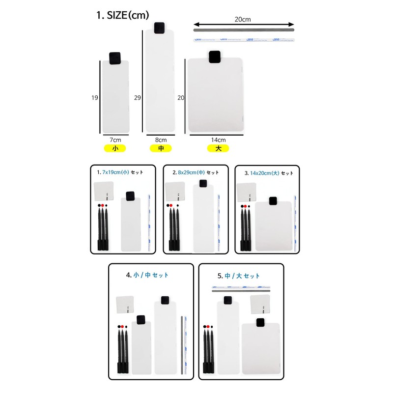 - [Rich set contents] 1. Dry erase board (small, medium, large) x 1 or 2. Magnetic stick x 1 or 2. 3. Marker pen x 3 (black, 2, red, 1). 4. Wipe cloth x 1, 5. Clip: 1