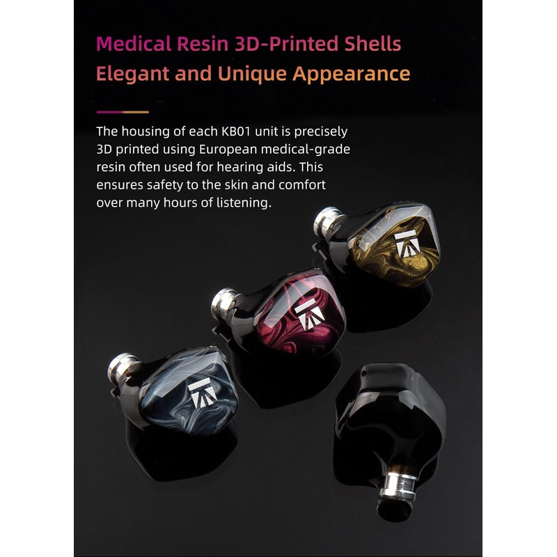 • [3D-Printed Shells Elegant and Unique Appearance] The housing of each KB01 unit is precisely 3D printed using European medical-grade resin often used for hearing aids. This ensures safety to the skin and comfort over many hours of listening.Walking down the street presents not just a pair of headphones, but a work of art that makes you shine. This IEMs earphones is a perfect gift for anyone, even if you're not an audiophile or a audio engineers, musicians