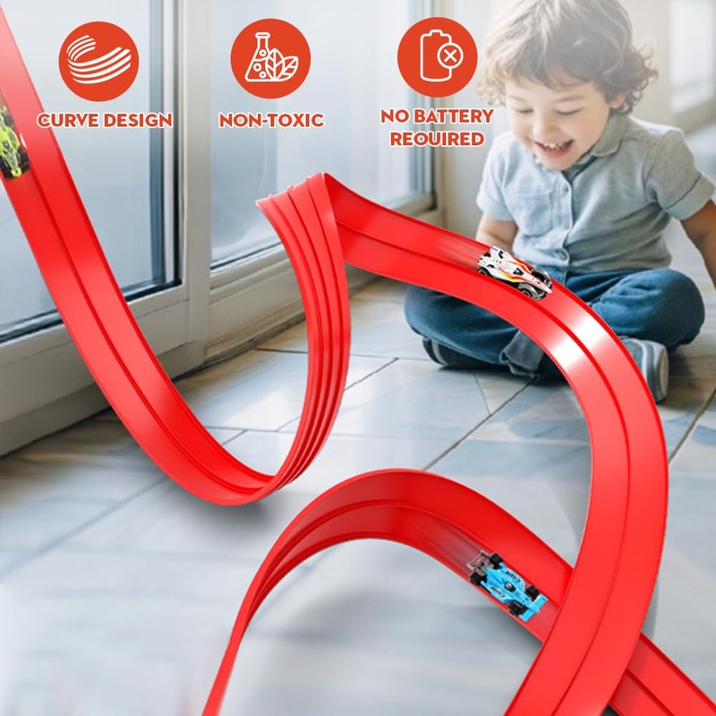 - Durable and flexible racetrack: the children's racing track is made of high-quality ABS material, it is resistant to fading, tearing and wrinkles and can withstand the wear and tear caused by children playing. The speed track race track can be easily rolled up and stored when not in use. The sturdy and durable design ensures that children can enjoy the game for a long time