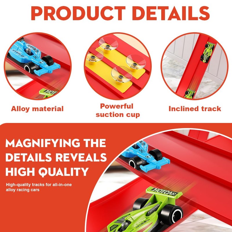 - Promotes creativity and imagination: No assembly required, the unique suction cup design allows for secure attachment to various smooth surfaces, use household items such as balconies, windows, walls or tables to create your own speed track racetrack. Let your cars race over bumps, jumps and loops - for even more thrills