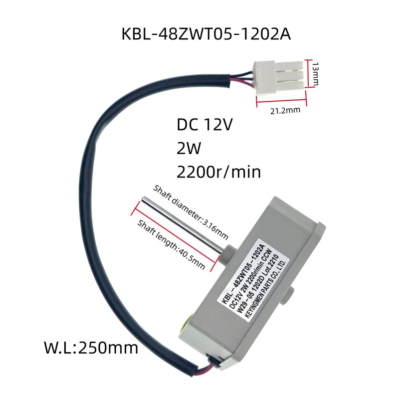 - The Refrigerator Condenser Fan Motor has electrical specifications of DC 12V 2W 2200r/min, and has a 3-pin connector, Shaft Length: 40.5mm, Shaft diameter: 3.16mm Line length:25cm 9.8in Warranty: 3-year.Warranty: 36 months 2W 2200r/min.