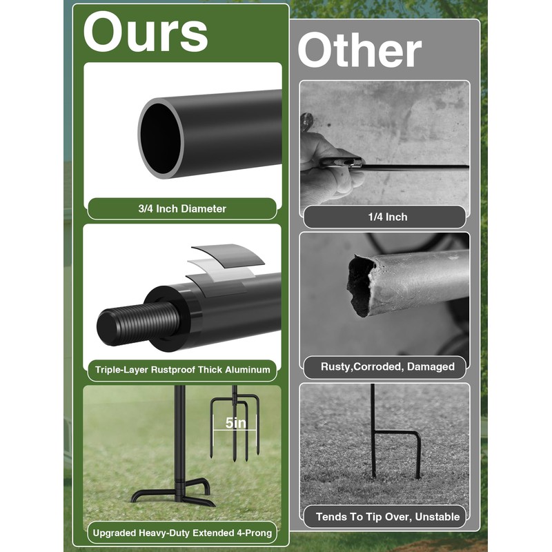 • Ultimate Stability for Outdoor Displays - Anchor your outdoor flag display with confidence using our garden flag stand, featuring an unshakable 4-prong base for steadfast ground grip. The 3/4" thick pole promises unwavering support, safeguarding your flag from unsightly bends or damage