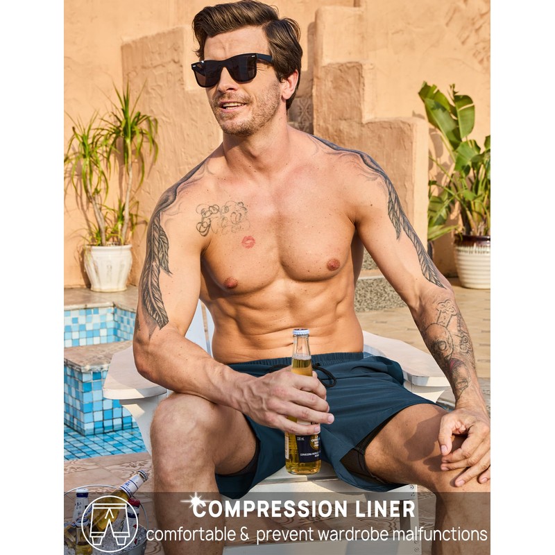 - 2-in-1 compression lining: integrated comfortable and soft boxer shorts inner lining protects your leg from friction and sand and prevents it from sticking to the skin when swimming trunks are soaked. 4-way stretch elastic lining hides your "things" better and ensures that you are not ashamed when you leave water. Gives you more privacy