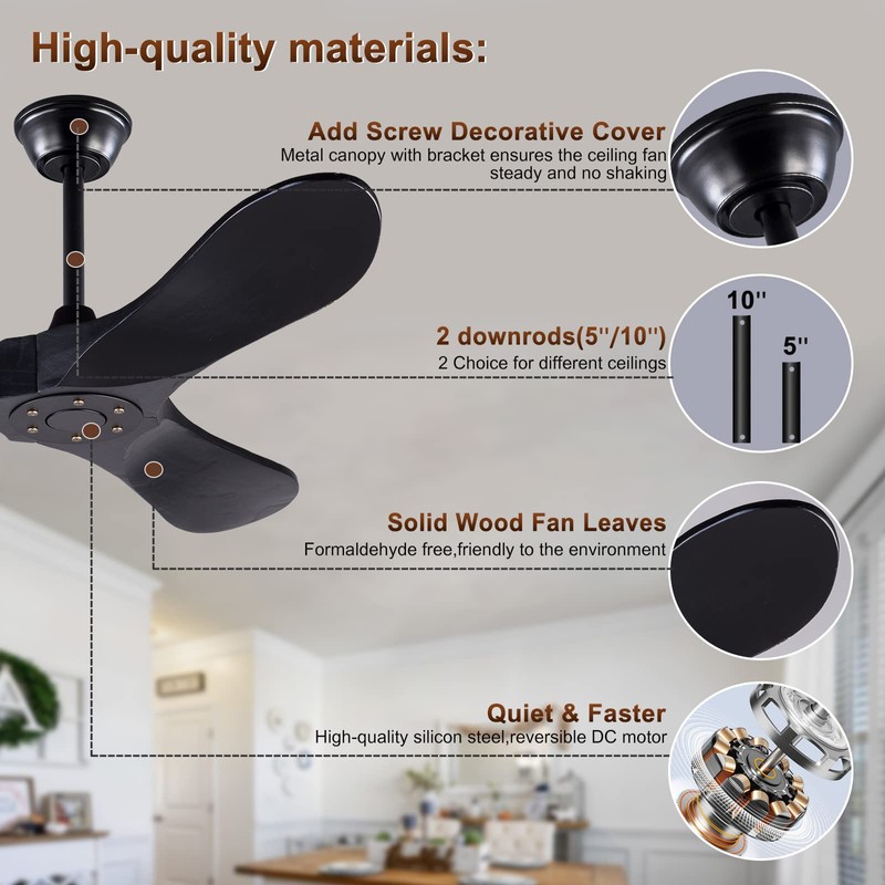 KBZZ 42 inch Ceiling Fan no Light, Black Solid Wood Ceiling fan with Remote Control and Reversible DC Motor, Indoor Bedroom Living Room Office Outdoor Ceiling Fans without Lightfor Patio