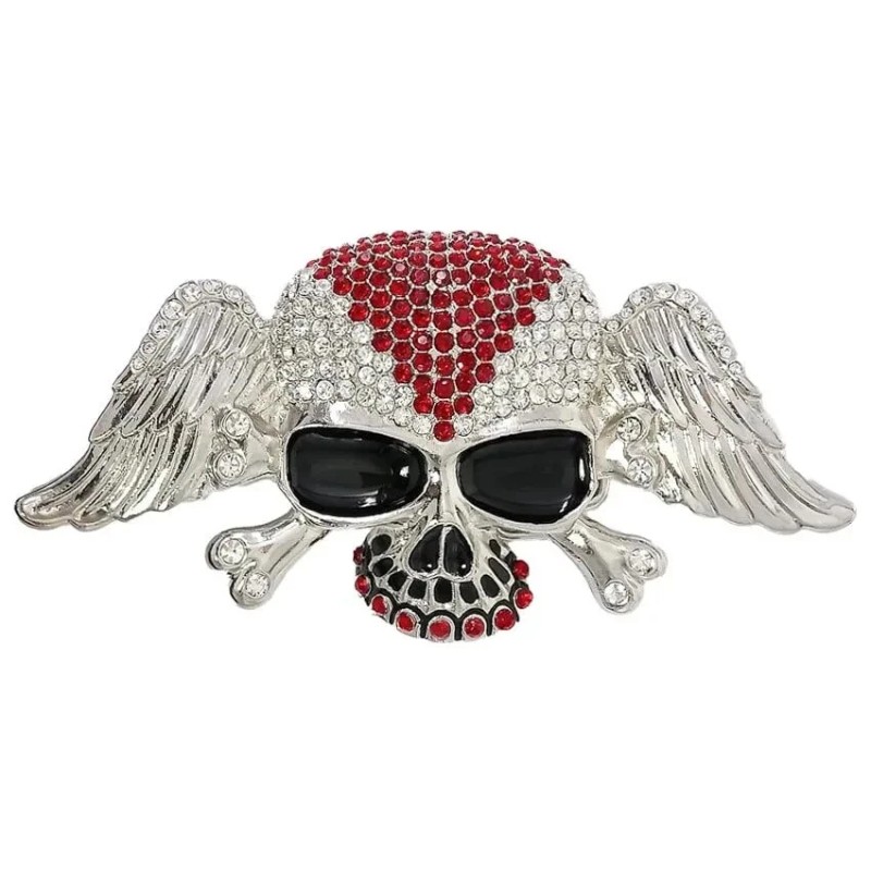 KC Large Silver Red Rhinestones Chrome Skull and Bones Belt Buckle