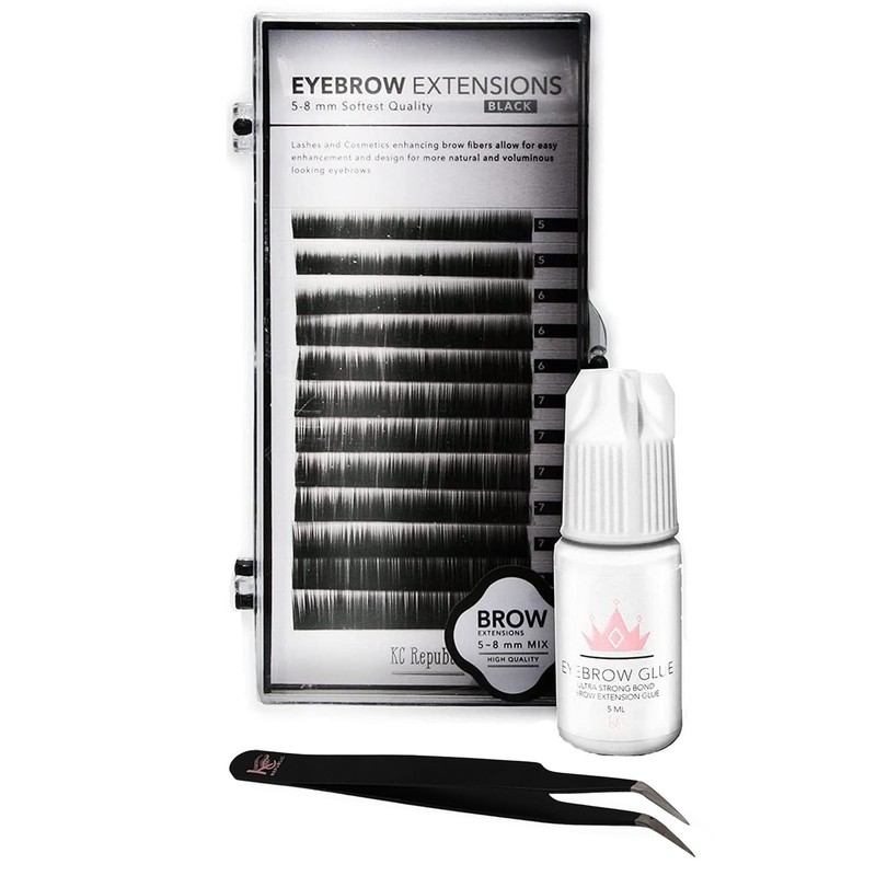 KC Republic KC Republic Lash Eyebrow Extensions Kit with 1 x Trays of Mink False Eyebrows in Black Comes on Mixed Length Trays 5-8 mm, Eyebrow Glue Clear & Extension Tweezers (Black Eyebrow, Black Tweezer)