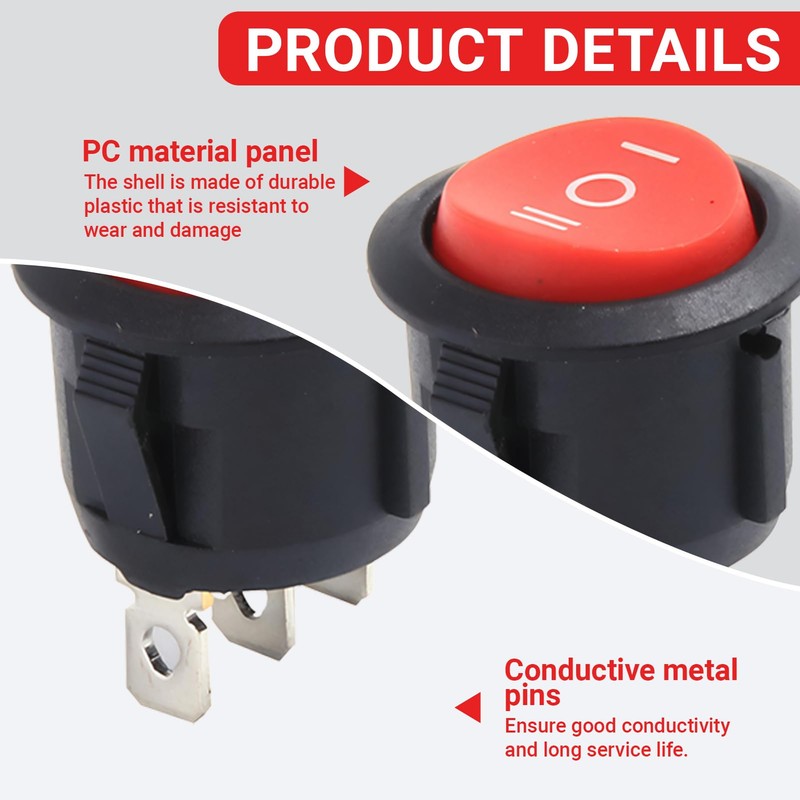 - Material Features The toggle switch is made of sturdy plastic. Toggle switches are small but practical with contact plugs made of conductive metal, quick installation without soldering and are suitable for household (6 A 250 V) or in the car (12 V). The plastic ensures good insulation and durability, while the metal ensures a reliable electrical connection.
