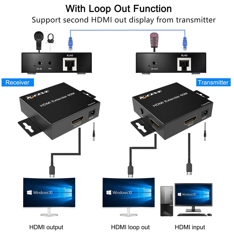 KCEVE HDMI Extender, 60M, Supports 1080p, EDID Management, Loop Out, Black