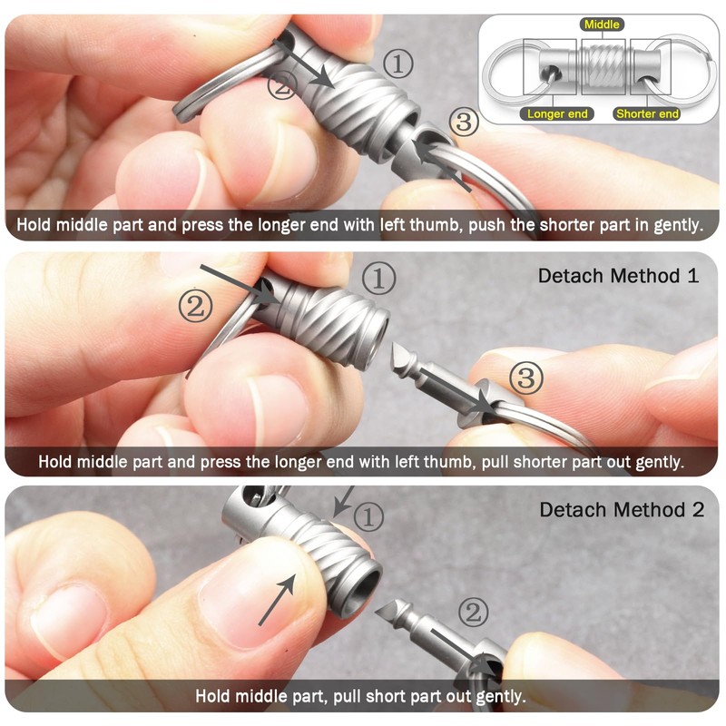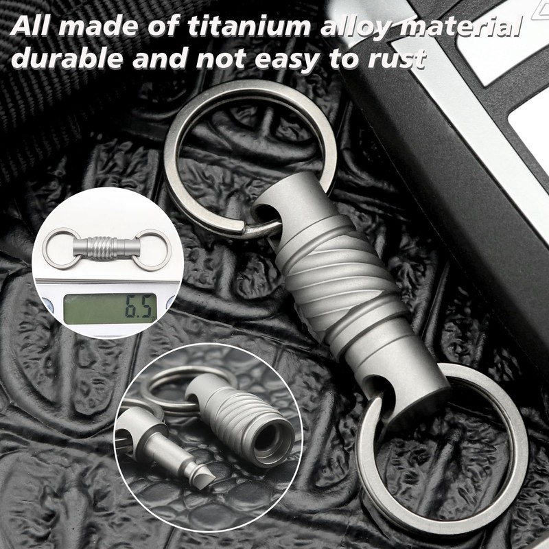 - Quick Release Titanium Keychain: Tired of detaching keys, especially large car keys by breaking your nails with traditional keychain? Now there is a solution! This detachable keychain allows detaching keys within seconds and at great ease. You only have to pull it apart with a little trick