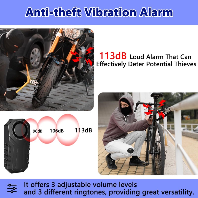 - 【Loud Alarm & Adjustable Volume】Up to 113dB super loud wireless bike alarm, scare off potential thieves effectively. Well-made alarm with great performance. 3 Levels Adjustable Volume, scooter alarm system anti theft with volume up to 113db, can scare off anyone and attract people's attention. Bike alarm anti theft also has a three-level volume adjustment function for selection.