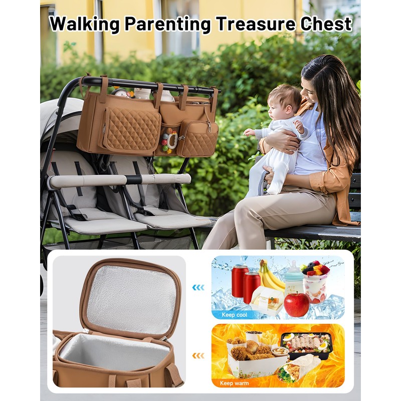 - 🍼Insulated Bag for Feeding Convenience--Equipped with an insulated compartment, this stroller organizer maintains your baby’s bottles and food at the desired temperature, whether warm or cool. Made from premium thermal materials, it ensures your infant’s feeding needs are met during short trips or long adventures.
