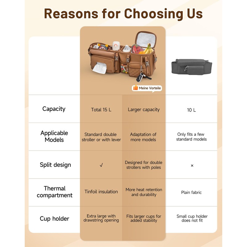 - 👶Specifically Designed for Double Strollers--This organizer is tailored to fit double strollers only, making it the ideal companion for side-by-side or tandem models such as Baby Jogger City Mini GT Double, Mountain Buggy Duallie, Bumbleride Indie Twin, and other similar models. Its adjustable mounting system ensures a secure fit on most double stroller bars, providing stability even in busy or crowded environments.