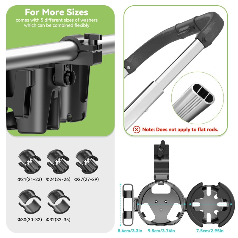 - 「多用途」ベビーカーカップホルダーは5種類のサイズのワッシャーを配備しており、直径2.1~3.5 cmの異なるサイズのハンドルに取り付けることができます。ベビーカー、乳母車、ウオーカー、車いす、自転車、スクーター、カート、ショッピングカート、モーターサイクル、ステーションワゴンなどに適しています。
