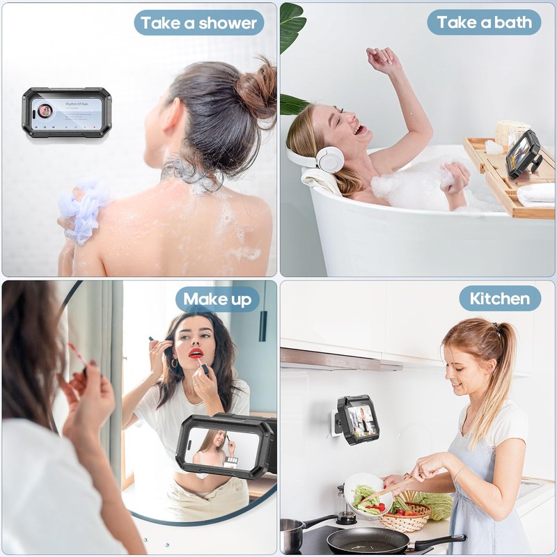 • Pantalla HD y Toque Suave – Equipado con una película impermeable PET, este soporte para teléfono de ducha ofrece una vista clara y una sensibilidad táctil sin interrupciones. La pantalla es libre de borrosidad y reflejos, permitiéndote ponerte al día con tus dramas y deslizar videos con colores reales. Al mismo tiempo, no afectará el Face ID, permitiéndote deslizar la pantalla y enviar mensajes sin problemas mientras te duchas.
