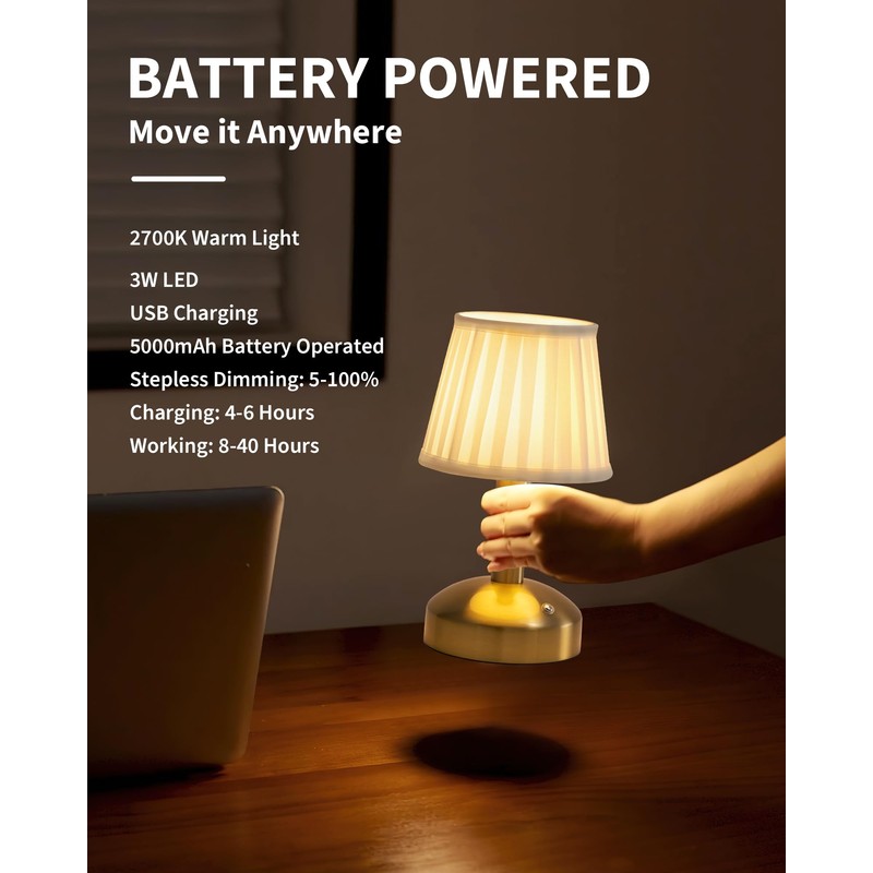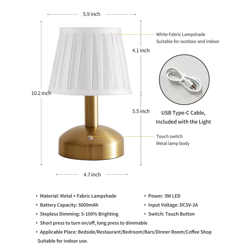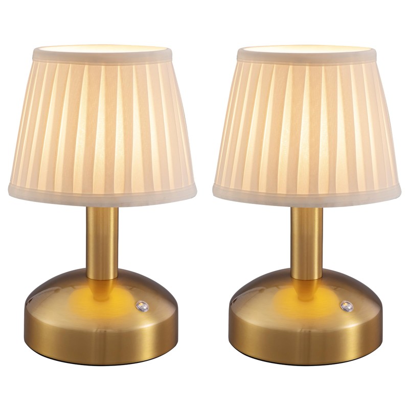 KDG Modern Cordless Small Table Lamp Set of 2, Portable LED Fabric Shade Desk Lamps, 5000mAh Rechargeable Battery Operated Lighting for Bedroom, Bar, Living Room, Dining Room, Night Light(Gold)