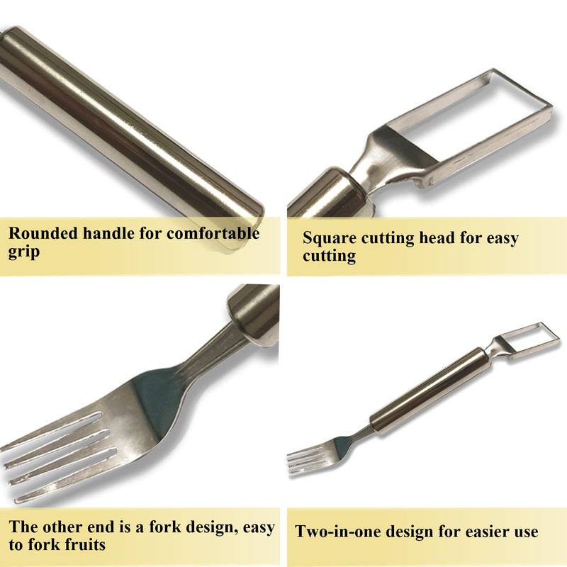 - Innovative Design: Our two-in-one knife and fork seamlessly integrates cutting and eating functions, ensuring a smooth fruit-eating experience. This design enhances practicality and convenience, making slicing and serving effortless and efficient. The round handle provides a comfortable grip, enhancing ease of use and control during food preparation and serving.