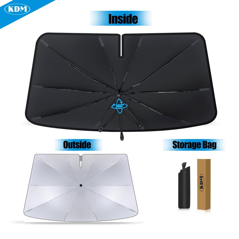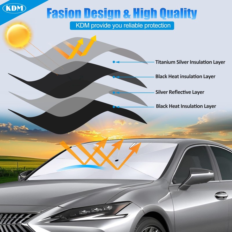 - 【Keep Cooling Environment】 Protect your car from sun rays & heat damage and keep car interior cool.KDM Front windshield sunshade adopts high-efficiency composite titanium, helping to reflect heat and harmful UV rays from the sun to protect leather seats from cracking and fading.Reduce heat buildup up to 40°F, and keep your vehicle cooler.