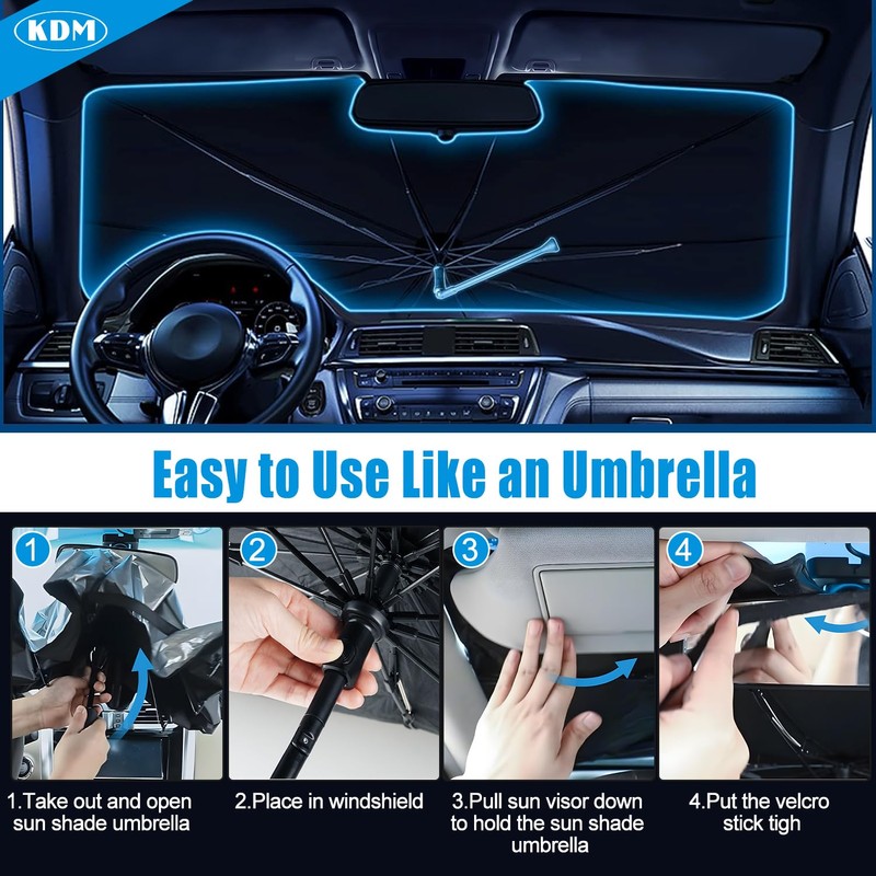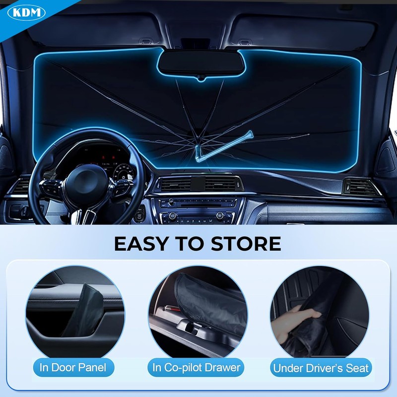 - 【Super Easy to Storage】KDM Front windshield sunshade easy to install and folds up quickly into the included carrying case, for easy storage and carrying. Folded, it easily fits into a door pocket or under the seats, to save you space in your car interior. Easy to twist, fold and store in the storage pouch.