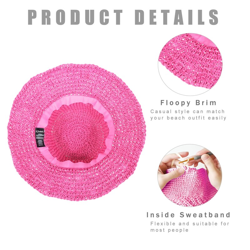 KDWAVE Floppy Straw Sun Hat Foldable Hand-Woven Crochet Straw Hats Outdoor Summer Beach Headwear for Women Girl, Fuchsia, One Size