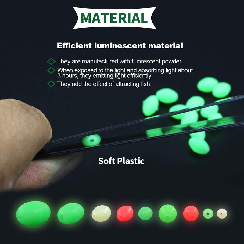 - ♛ 『 PACKAGE INCLUDED』 This fishing bead assorted kit contains soft luminous oval shaped beads and round beads total 1050 pieces, including 9 different specifications: white round beads 4mm in diameter and white oval shaped beads 7×10mm, green round beads 4mm and 7mm, green oval shaped beads 5×7mm and 8×12mm, red round beads 6mm and red oval shaped beads 6×8mm, which are perfect for your various professional fishing projects.