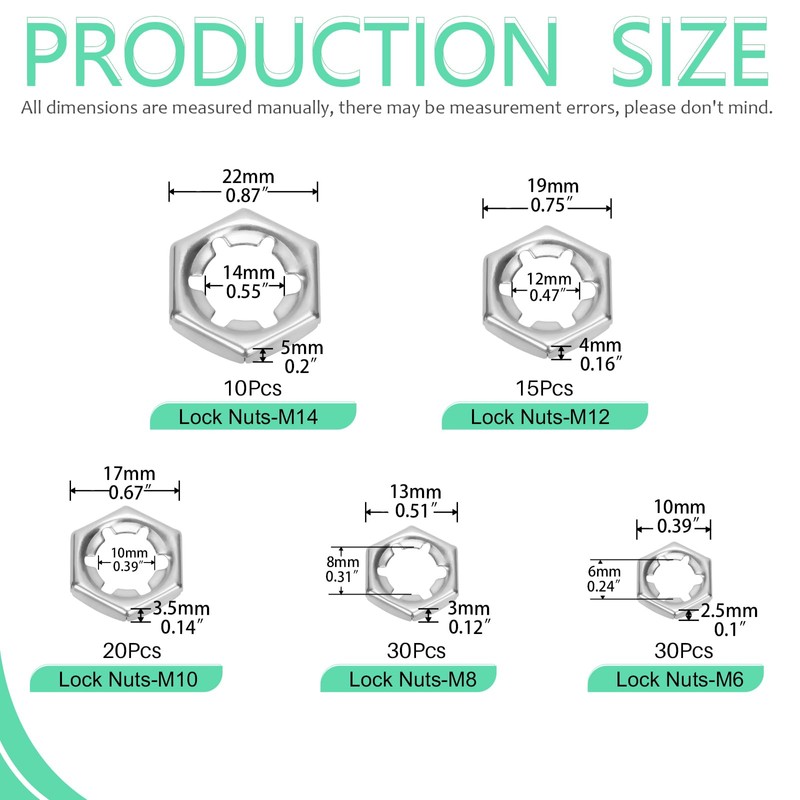 • 【Package Included】You will receive 105pcs silver push on lock nuts in 5 sizes, and they are packed in a clear box for easy carry and storage. Sufficient quantity and rich sizes can meet your daily usage needs!