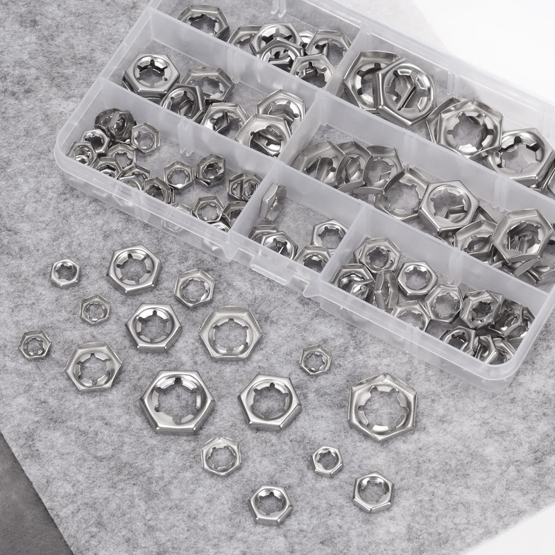 Push on lock nuts assortment kit are packed in a clear box for easy carry and storage.
