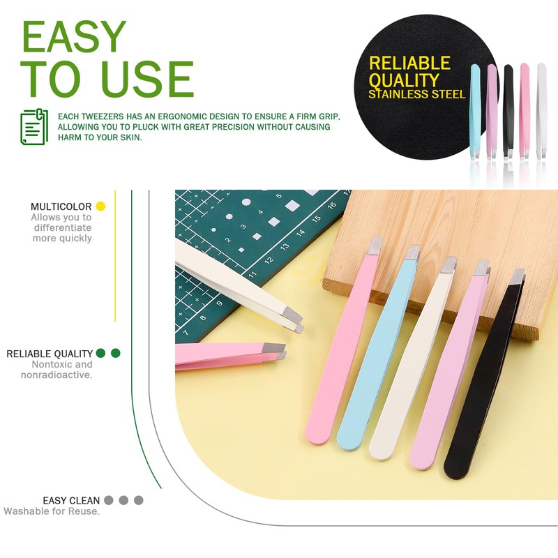 - 【Easy to Hold & Store】 The width of tweezers handles is 10mm/ 0.39inch for easy to hold, which ensures a firm grip and provides a more comfortable and handy experience when you use the tweezers. Our eyebrow tweezers are so compact that you can easily carry in your bag and pocket. For maximize safety, each slant brow tweezers comes with a separate plastic ring, which keeps the open tweezers together for easy storage and without damage.