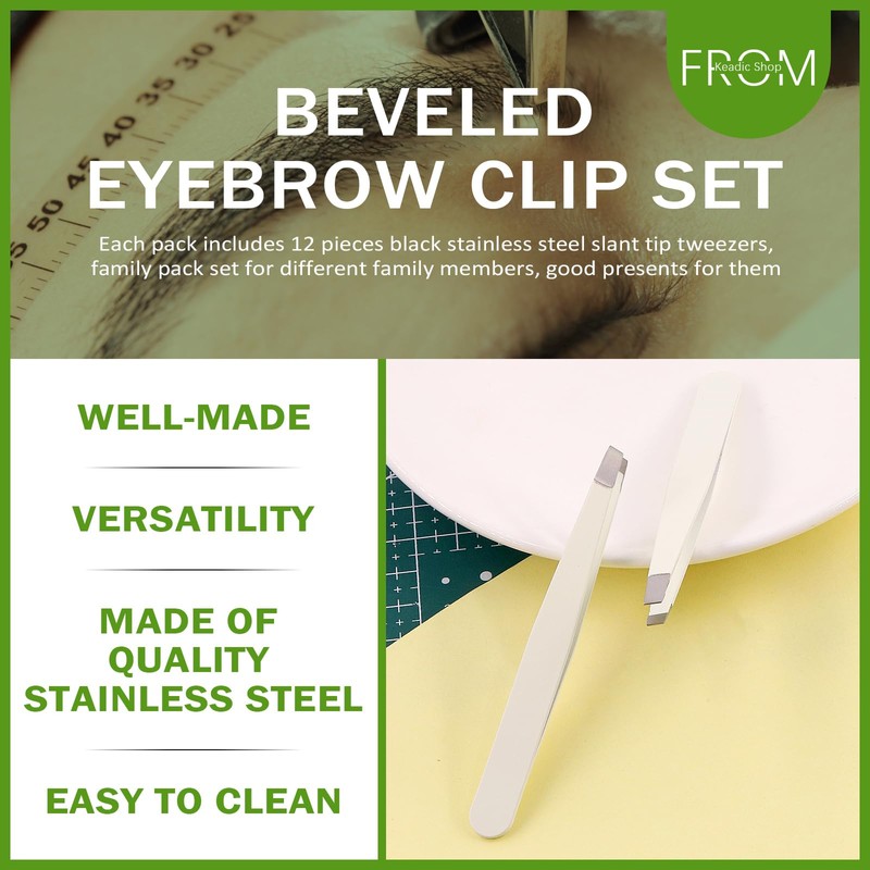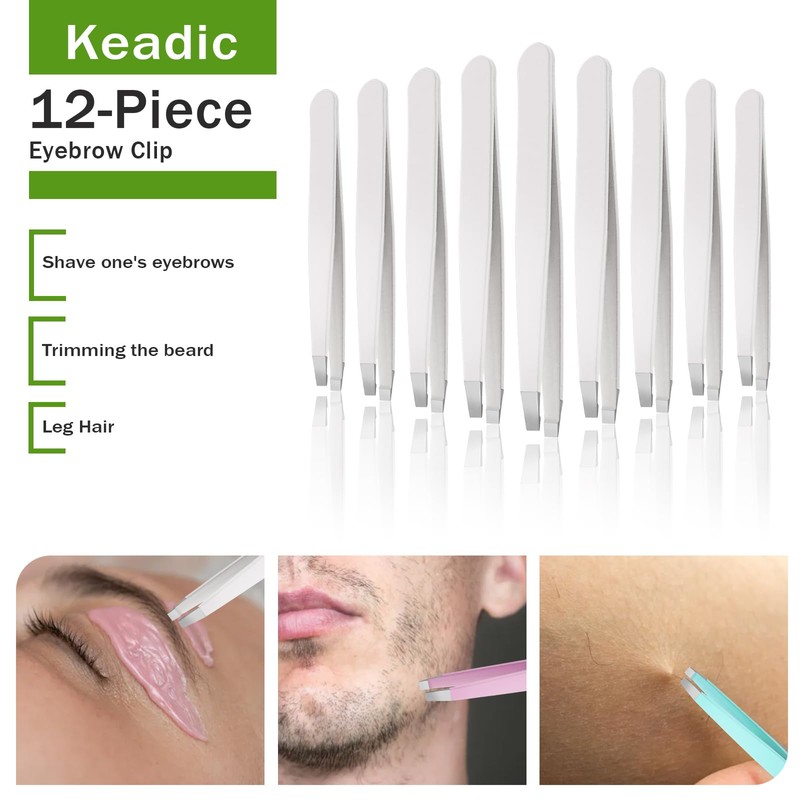 Keadic 12Pcs Slanted Eyebrow Tweezers Bulk Set, Stainless Steel Eyebrow Precision Tweezers for Men and Women, Eyebrows Facial Hair, Splinter, Ingrown Hair, and Lash Extension (White)
