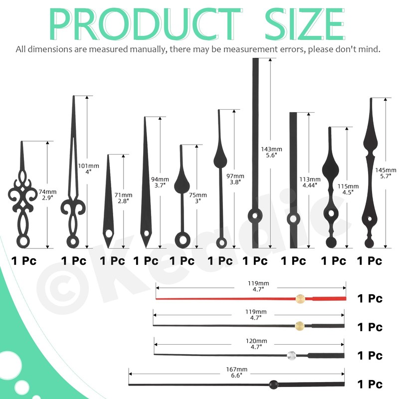 - 【5 Style of Clock Hands】 All clock hands are made of premium aluminum, which are lightweight, rust and corrosion resistant for a long service time. The package included 5 sets of clock hands to choose from, to accommodate quartz clocks in different diameter and style! You can use these new hands to replace bent or broken old ones. Warm note: When you install the clock hands, please do not use too much pressure as this may cause the hands to bend.