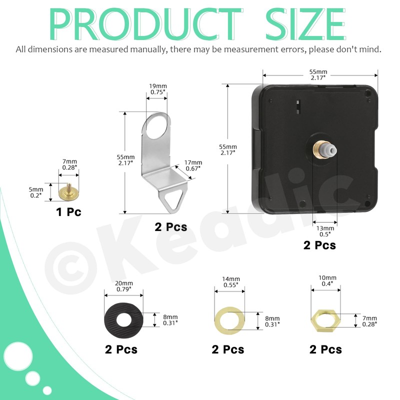 - 【What You Get】 The 25pcs quartz clock mechanism replacement set includes 2pcs silent movement with 13 mm/ 0.51 inches shaft, 14pcs clock hands, 2pcs metal hooks, 2pc brass nuts, 2pcs plastic washers, 2pcs brass washers and 1pc screw. The complete lock mechanism replacement set will meet all your requirements!