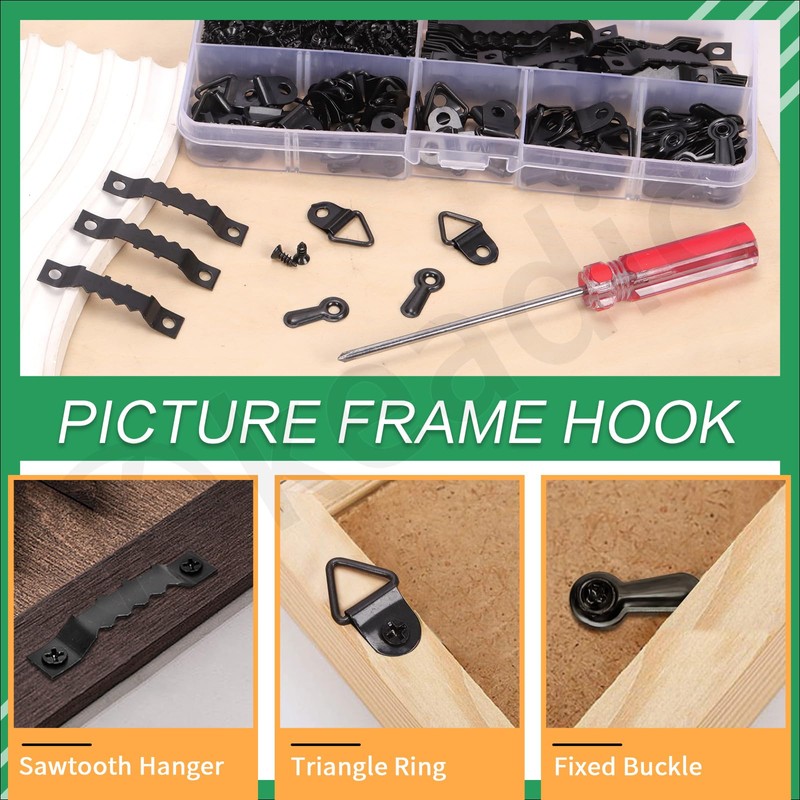 - 🌸【What You Will Get】In this kit, you will get 401pcs picture frame hangers sets, which include 50pcs black sawtooth picture hangers, 50pcs black d ring picture frame hanger, 50pcs black picture frames turn button, 250pcs black screw, 1pcs screwdriver. They are all packed in a clear box for easy storage. Sufficient quantity can meet your daily usage needs.
