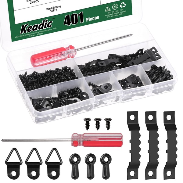 Keadic 401PCS Picture Frame Hangers Assortment Kits Including Sawtooth Photo Frames Holder, Picture Frames Turn Button, D Ring Picture Frame Hanger, Screwdriver for Hanging Pictures(Black)
